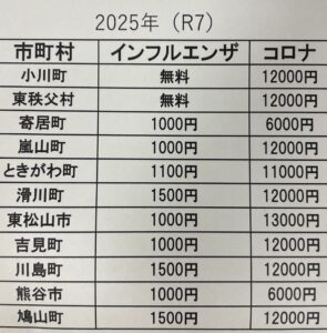 下の写真は、高齢者のインフルエンザおよび新型コロナワクチンの自己負担金(各市町村別)です。