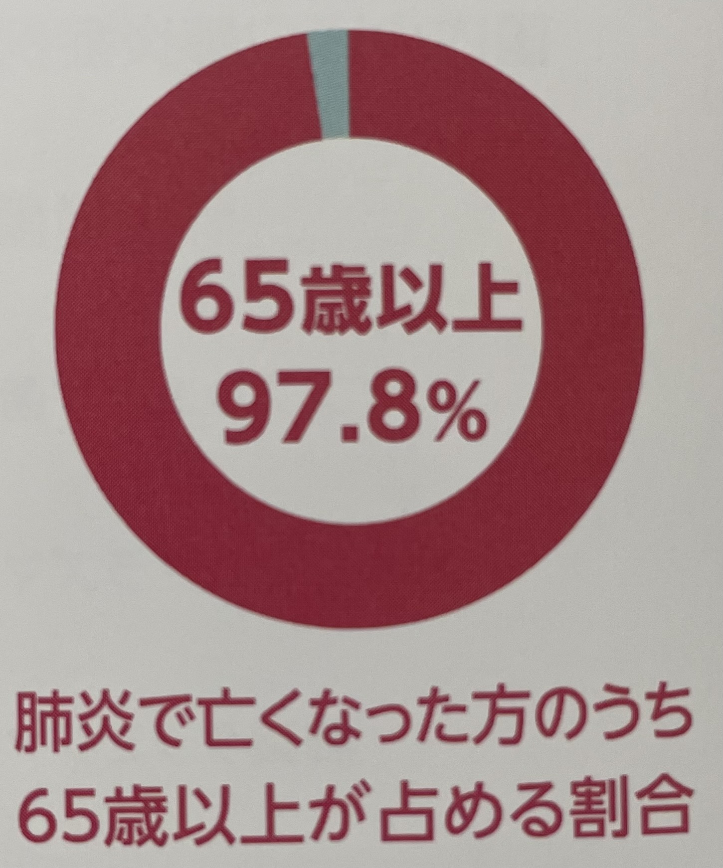 肺炎は、かつて日本の死因の第1位の時期もありましたが、抗生剤の普及により激減しました。しかし近年、高齢化に伴って再び増加傾向となり、2016年には死因の3位にまで上昇しました。2020年の死因は①がん②心疾患③老衰④脳血管疾患⑤肺炎⑥誤嚥性肺炎の順ですが、老衰には肺炎が関与していることが多く、誤嚥性肺炎も含めると死因の3番目となっている可能性が考えられます。特に肺炎で亡くなる方の97.8%が65歳以上です。したがって、肺炎球菌ワクチンの接種は命を守る上で非常に重要だと考えます。