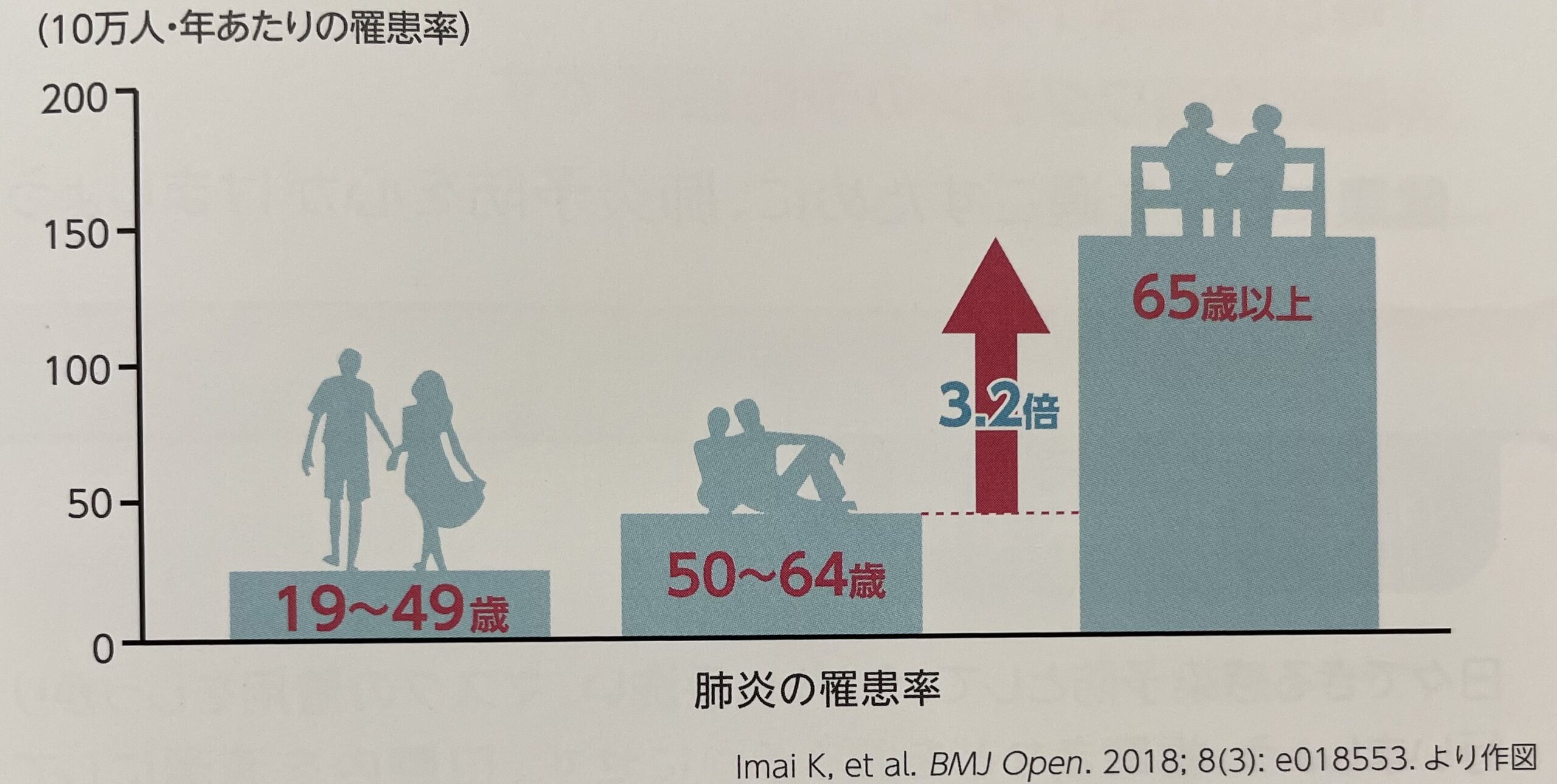 加齢に伴い、肺炎の罹患率も上昇します。下の写真は、肺炎の罹患率が65歳以上で最も多かったという報告をまとめたものです。
