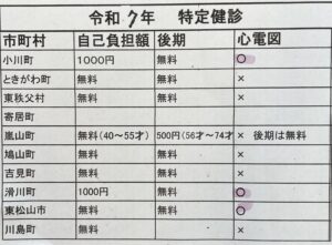 写真は、住民票のある市町村別の令和7年自己負担額です。心電図検査に◯がついている市町村では実施できますが、×がついている町村では実施できません。
