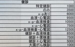 写真の表は、当院の健診項目別の自己負担額です。「のみ」とは、尿検査のみという意味です。「xーp」とは、胸部X線写真という意味です。