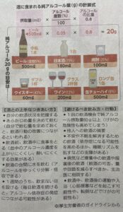 写真は、2025年11月7日の朝日新聞17面に掲載された、純アルコール20 gの目安、酒との上手な付き合い方、避けるべき飲み方をまとめた図です。