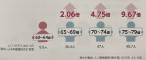 加齢に伴い、肺炎の死亡率も上昇します。下の写真は、人口10万人あたりの肺炎による死亡率が、60〜64歳と比べて、65〜69歳、70〜74歳、75〜79歳それぞれの場合で何倍になるかをまとめたものです。
