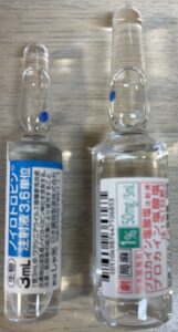 下の写真は、当院の痛み止めの注射薬です。写真の2剤を混ぜた8 mlを患者さんの痛い部分(腰・背中・肩)に筋肉注射します。2ヶ所または4ヶ所の注射場所を患者さんに選んでいただきます。