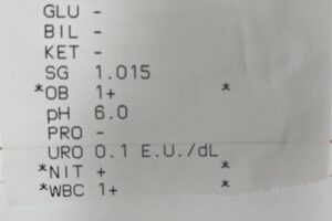 下の写真は実際の尿検査結果で、OB 1+とは尿潜血があり、WBC 1+とは尿中に細菌に対する白血球があることを示しています。つまり、尿中に細菌がいる可能性が高いことが分かります。