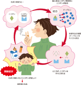 下の図は、タバコがやめられなくなるニコチンの負のスパイラルについてまとめたものです。