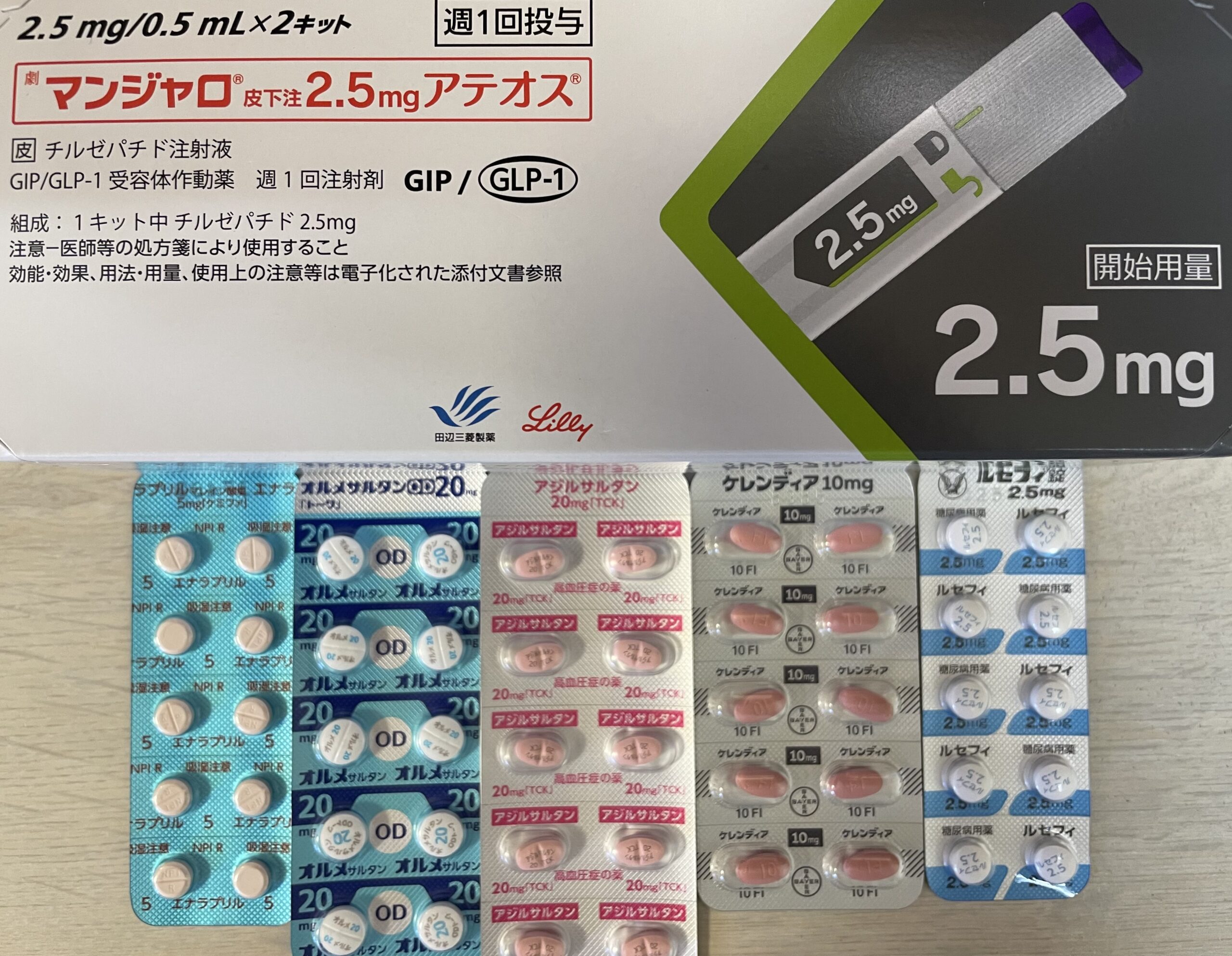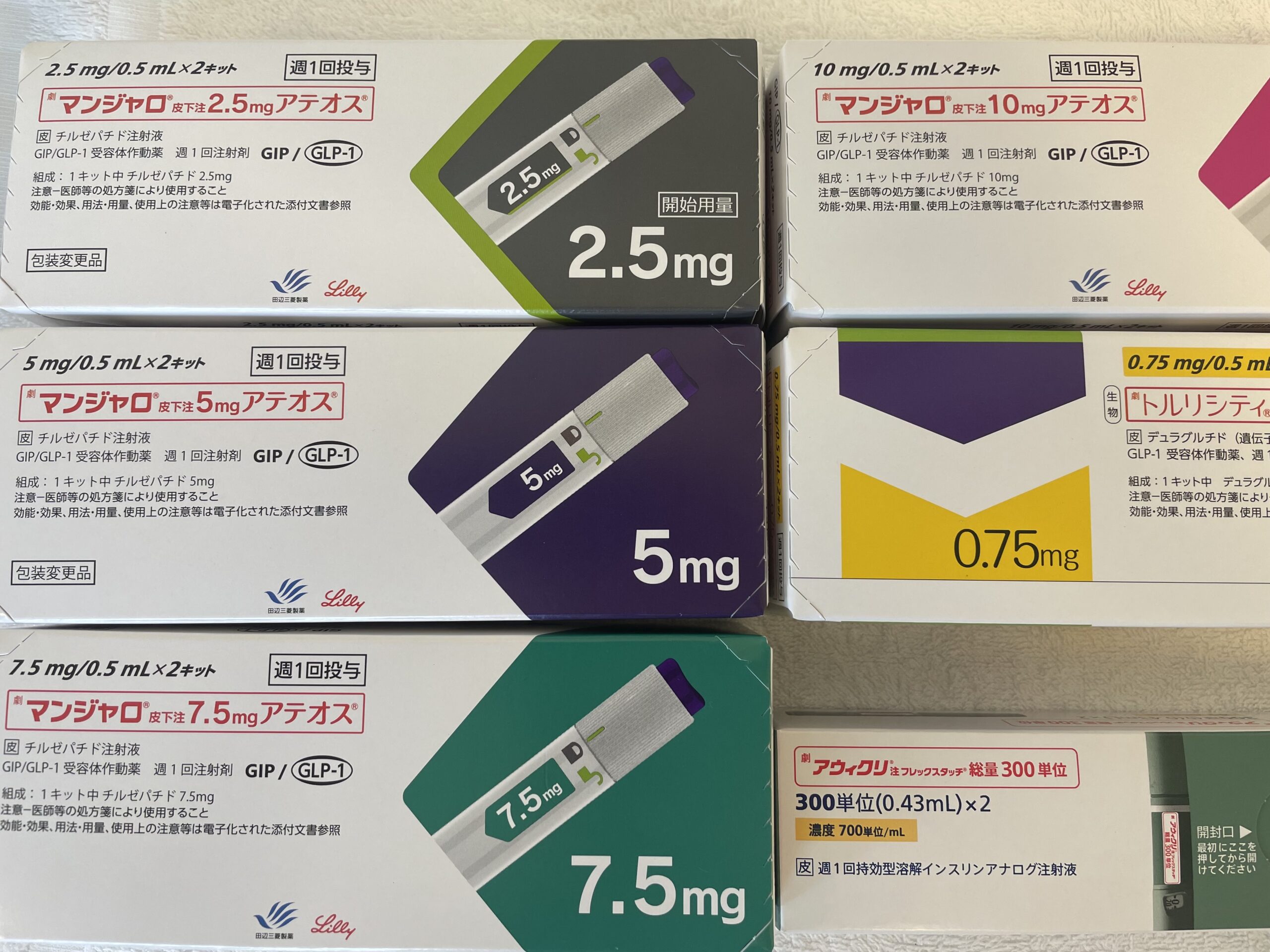 写真は、当院の週1回自己注射の一覧です。左と右上はマンジャロ、右の真ん中はトルリシティ、右下はアウィクリです。