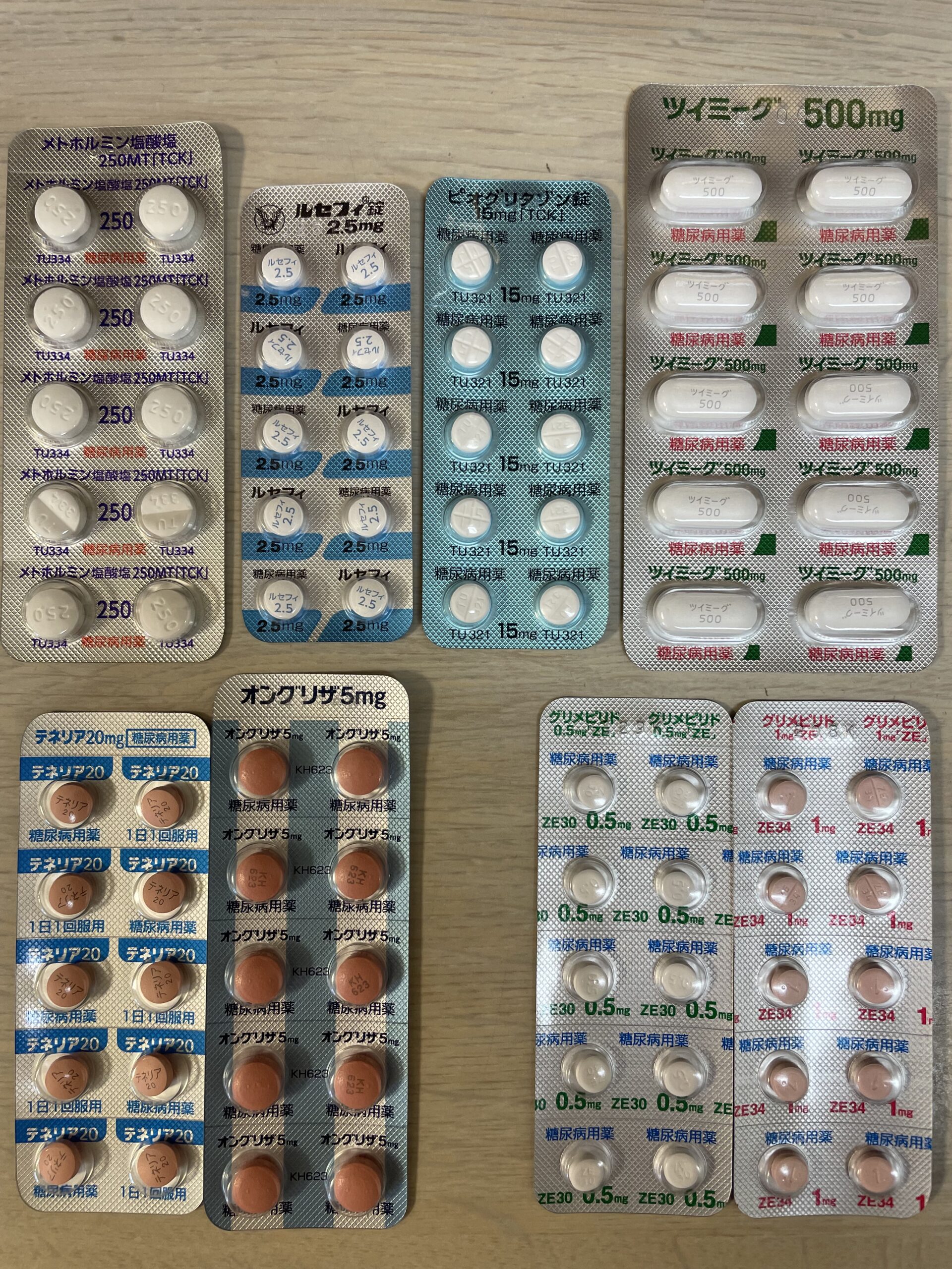 写真は、当院の血糖値を下げる飲み薬一覧です。左上から右上に向かって、ビグアナイド薬(メトホルミン)、SGLT2阻害薬(ルセフィ)、チアゾリジン薬(ピオグリタゾン)、イメグリミン(ツイミーグ)です。左下はDPP-4阻害薬(テネリア、オングリザ)、右下はSU薬(グリメピリド)です。写真上の4種類は主に肥満の方、写真下の2種類は非肥満の方に処方します。