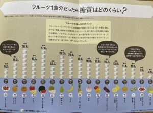 下の写真は、果物の糖質量をまとめた表で、柿やすいかで特に多いと示されています。