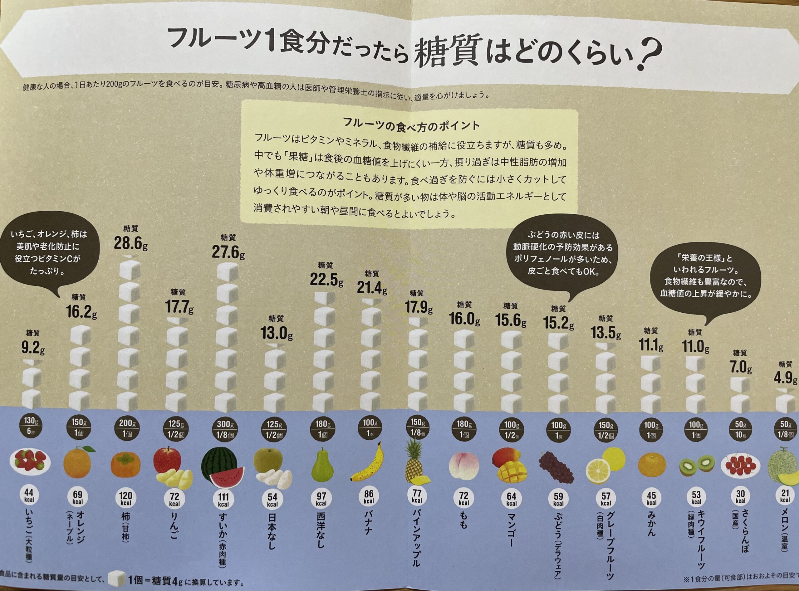下の写真は、果物の糖質量をまとめた表で、柿やスイカで特に多いと示されています。