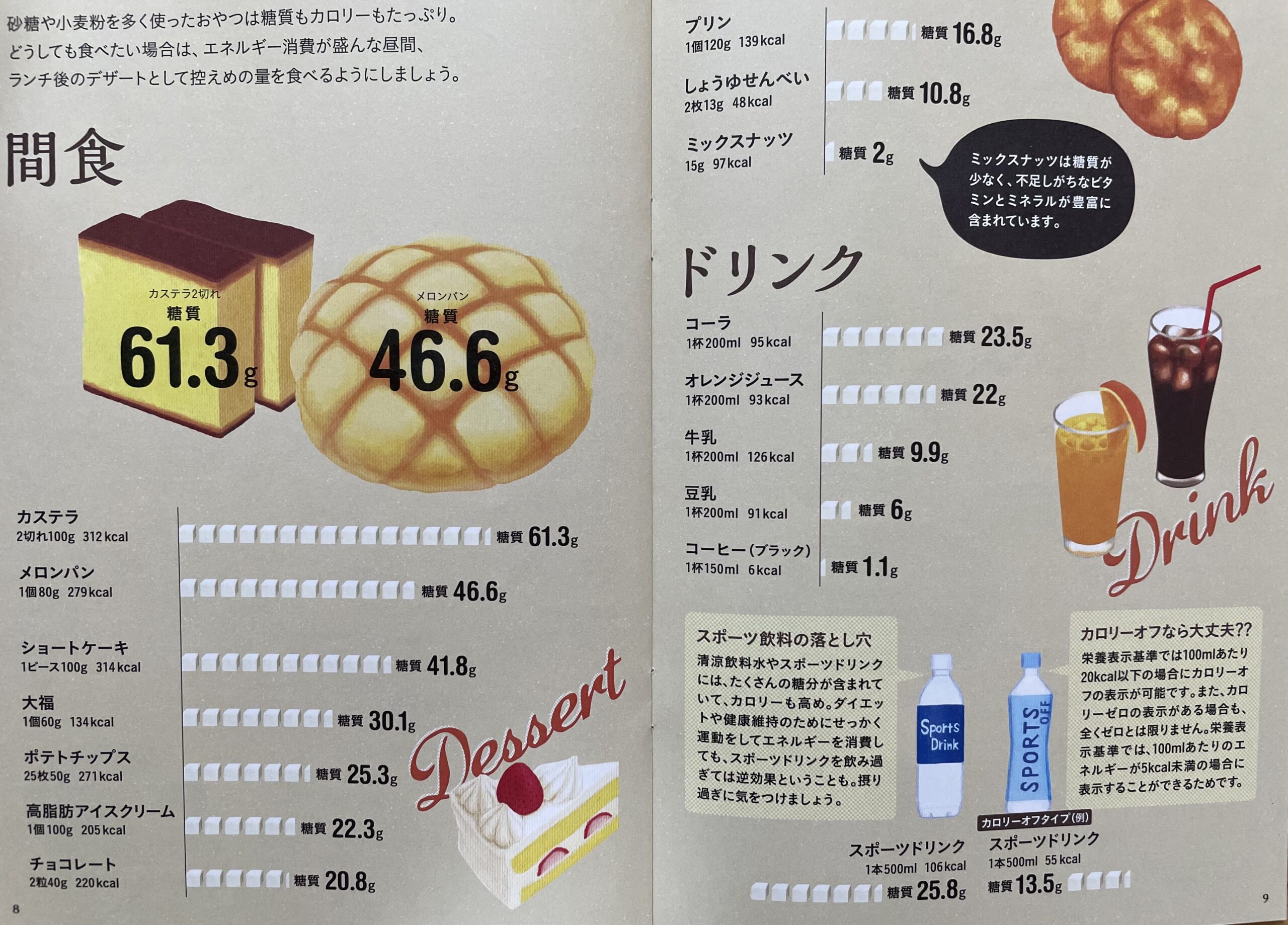 下の写真は、間食の糖質量をまとめた表です。カステラやメロンパンで特に多いことが示されています。