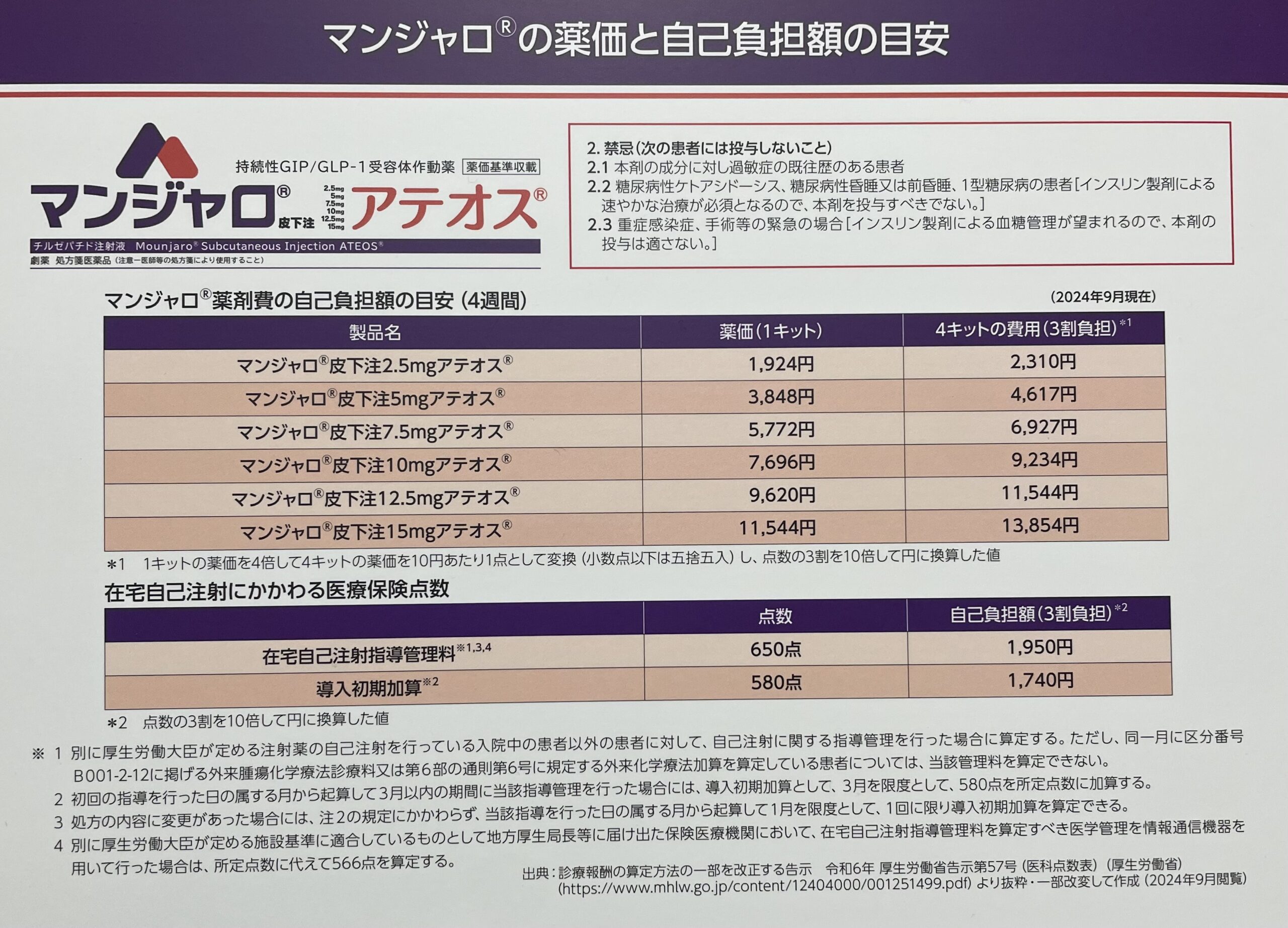 下の写真は、保険診療における、マンジャロの用量別薬価と自己負担額の目安です。