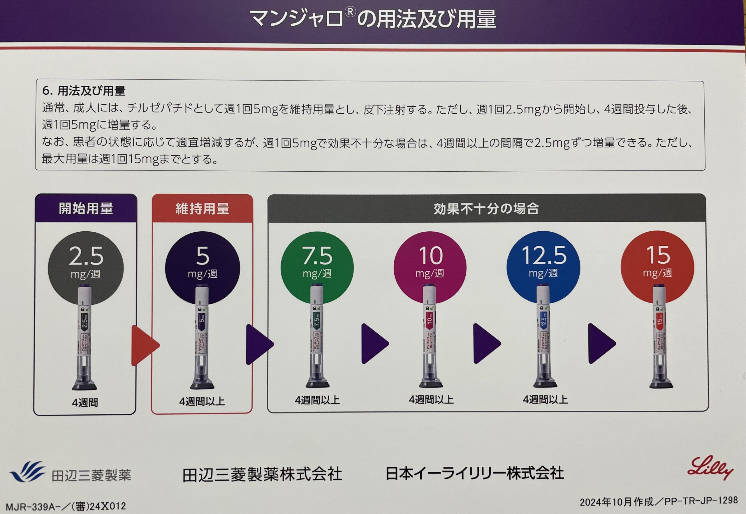 下の写真のように、週1回2.5mgから開始し、4週間投与した後、週1回5mgに増量します。その後は適宜増減し、週1回5mgで効果不十分な場合は、4週間以上の間隔で2.5mgずつ増量できます。