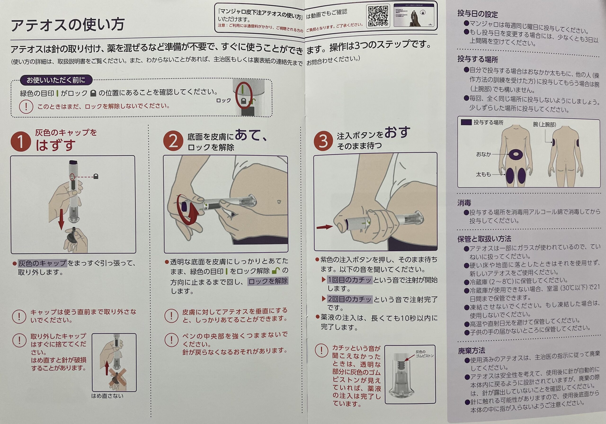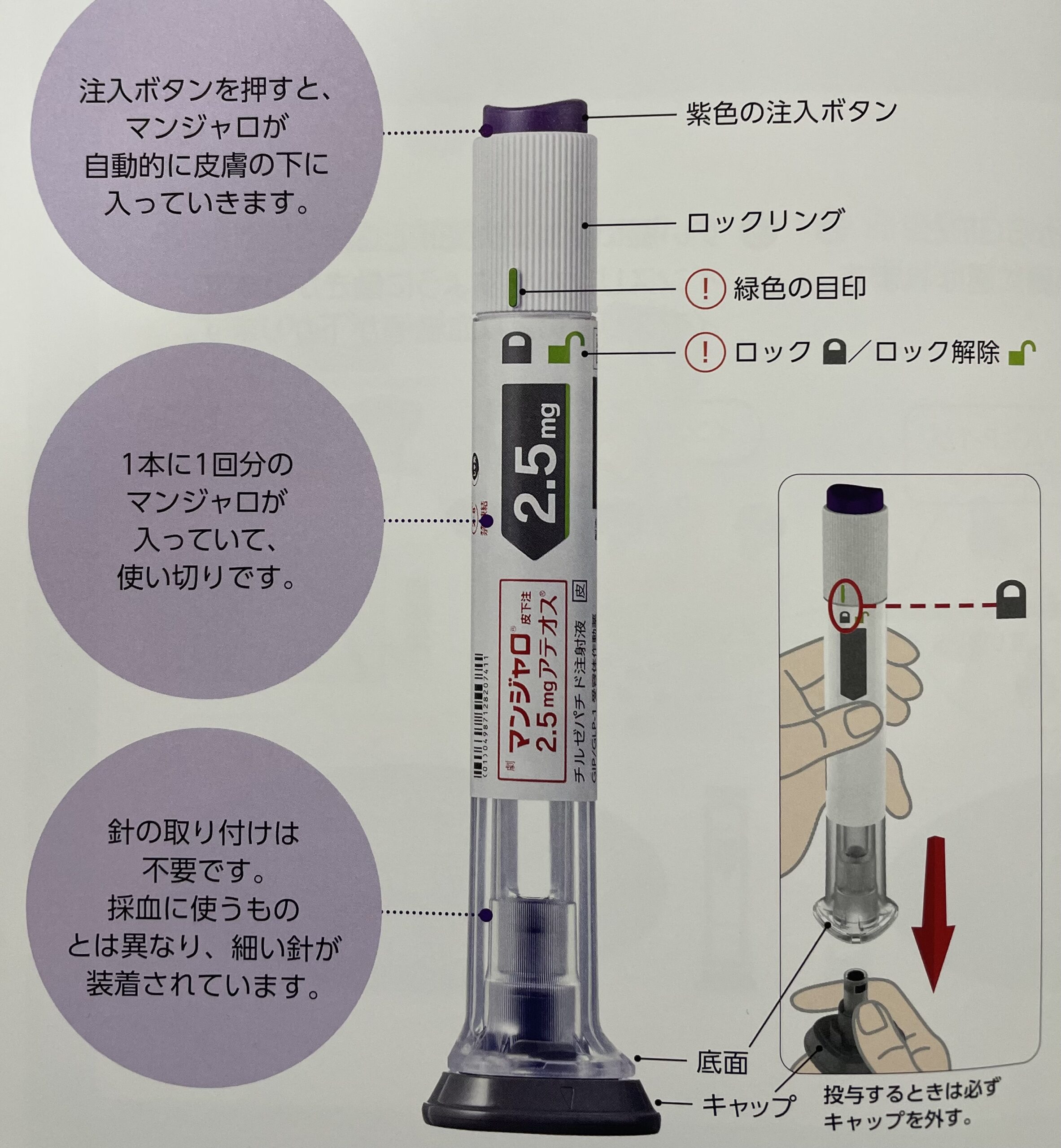 マンジャロは、操作が簡単なアテオスという専用ペンで、1週間に1回投与します。アテオスの名称は、「あてて、押す」という使い方に由来しています。