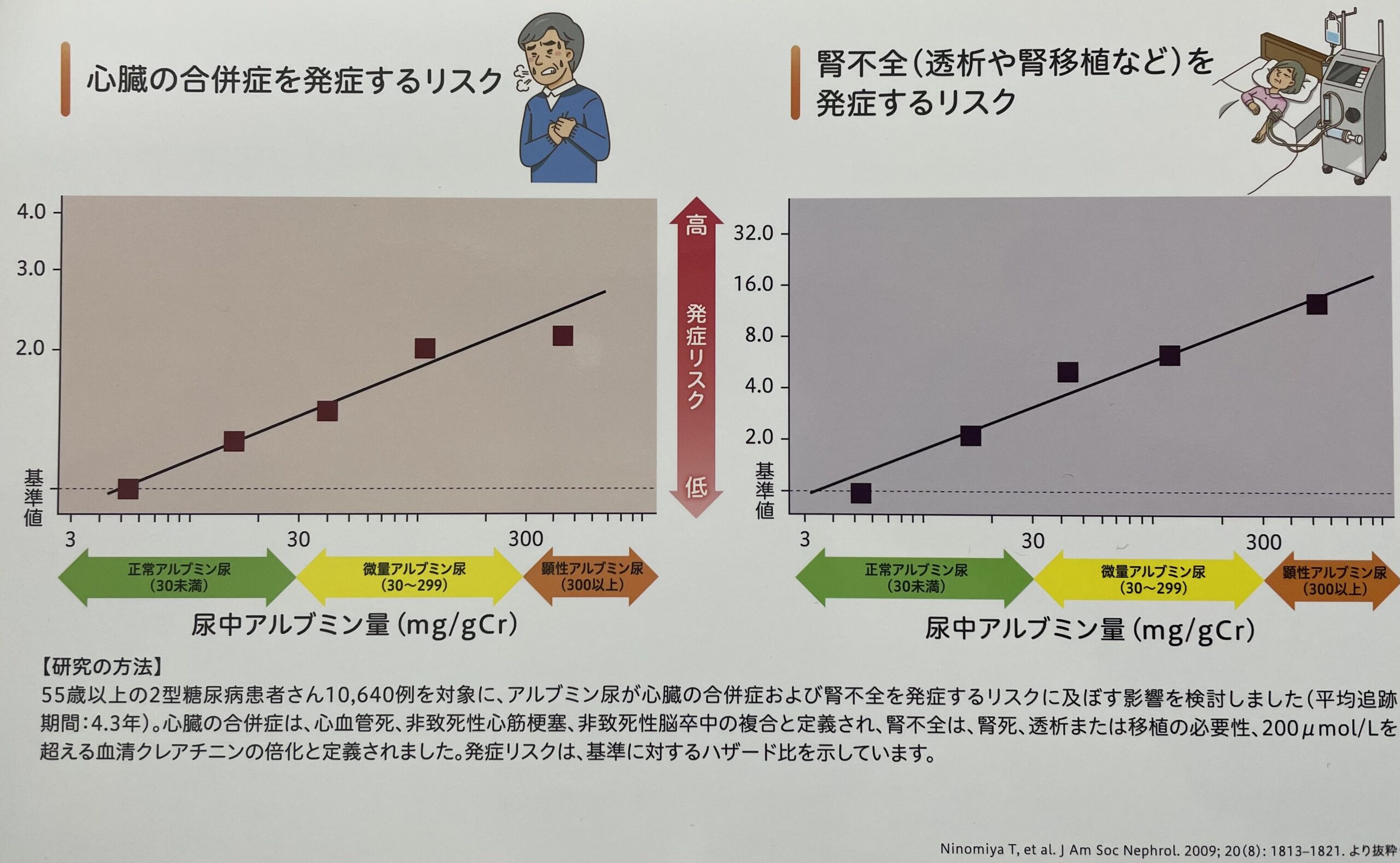 当院では、約3ヶ月に1回、アルブミン尿を測定し、腎症の重症度を判定しています。尿中のアルブミンが増えるほど、心臓の合併症や透析などに至るリスクが高まることから、改善させる治療が大切です。