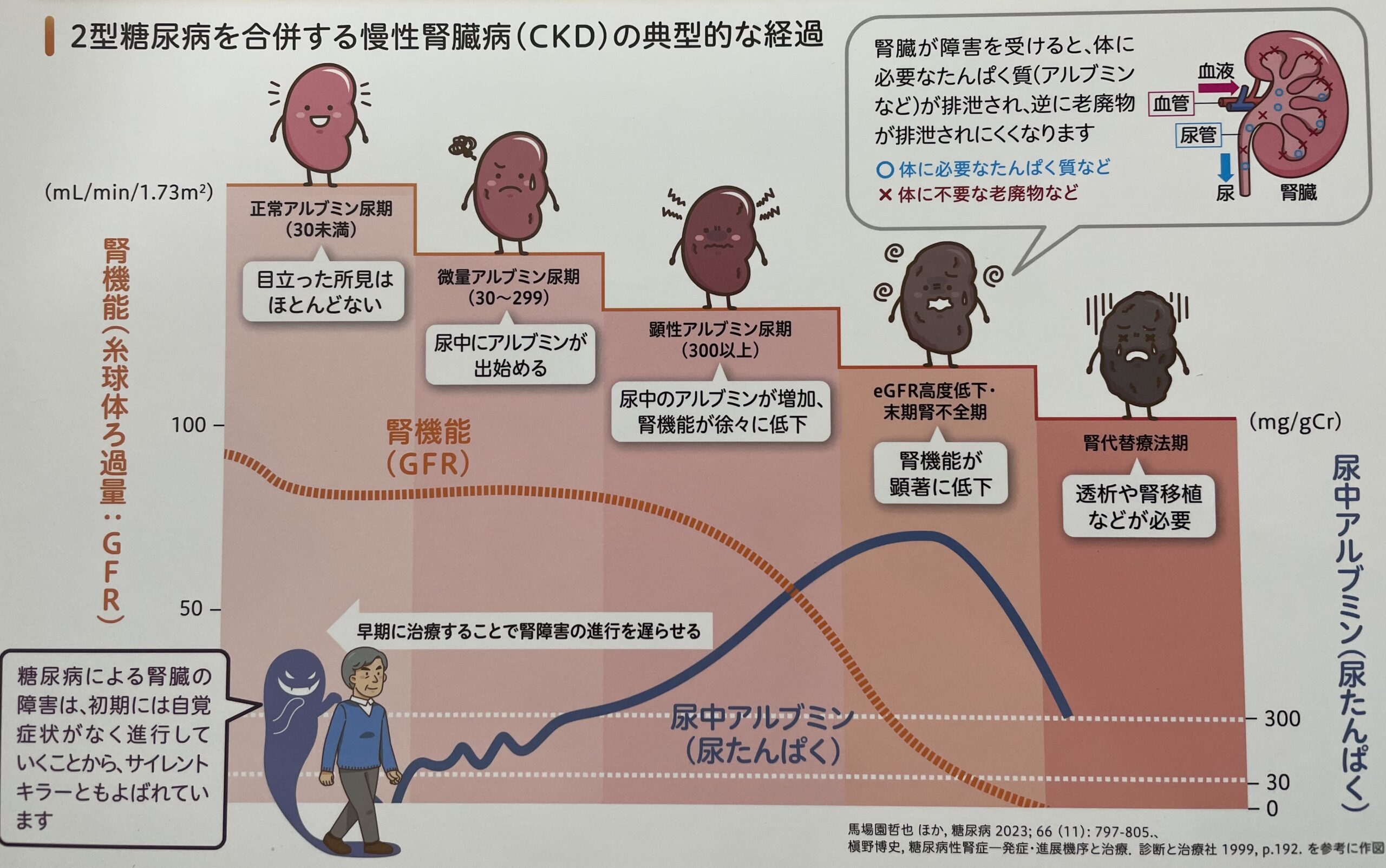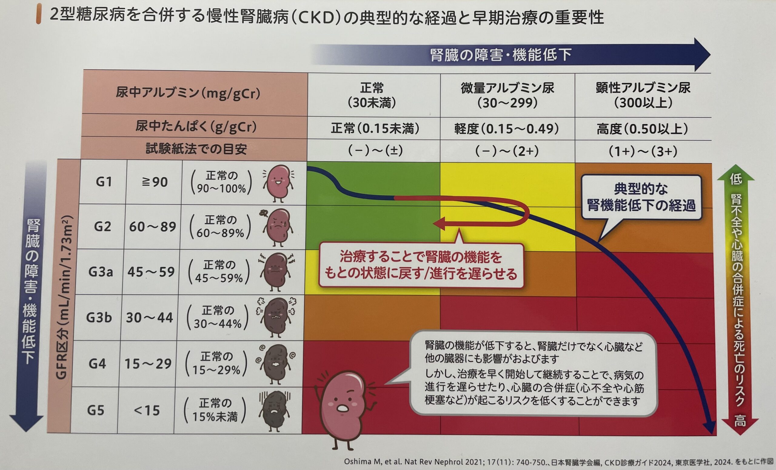 糖尿病腎症が進行すると、腎臓の機能を戻すことが難しくなるため、治療を早く開始して、継続することが重要です。